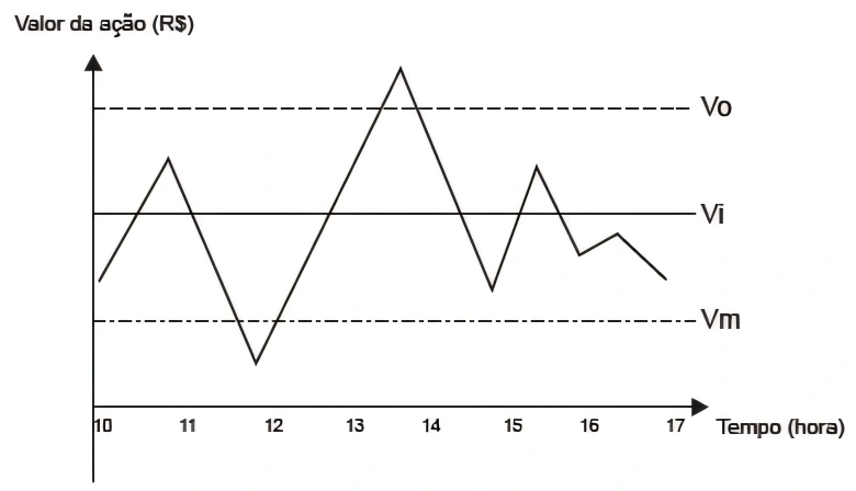 O gráfico apresenta o período de operações e a variação do valor de cada ação, em reais, no decorrer daquele dia e a indicação dos valores ideal, mínimo e ótimo.Quantas operações o investidor fez naquele dia?