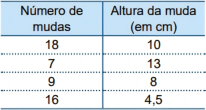 Considerando as alturas de todas essas mudas, a média, a moda e a mediana são, respectivamente,
