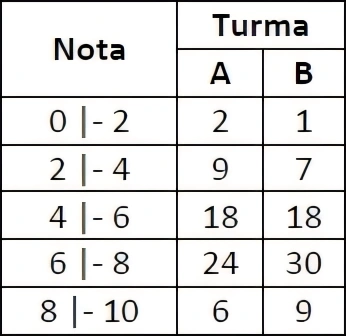 MatemáticaUNINTA2016A tabela representa as notas, agrupadas em classes com suas respectivas frequências absolutas, de duas turmas, A e B, em um simulado de exame pré‐vestibular.