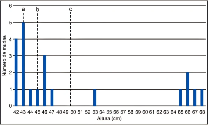 Os valores indicados por a, b e c no gráfico representam, com relação às alturas das mudas, respectivamente,