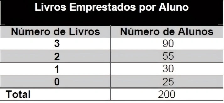MatemáticaUPE2016Preocupada com o hábito de leitura na escola onde trabalha, uma bibliotecária aplicou uma pesquisa, num grupo de 200 estudantes escolhidos de forma aleatória, sobre a quantidade de livros que cada aluno havia solicitado por empréstimo no primeiro semestre de 2015. Os dados coletados na pesquisa estão apresentados na tabela a seguir: