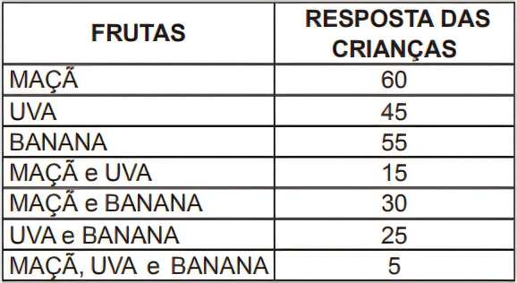 Baseado na tabela acima, podemos afirmar que o número de crianças que gostam somente de uma fruta é: