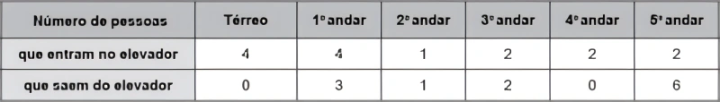 MatemáticaENEM2016Ao iniciar suas atividades, um ascensorista registra tanto o número de pessoas que entram quanto o número de pessoas que saem do elevador em cada um dos andares do edifício onde ele trabalha. O quadro apresenta os registros do ascensorista durante a primeira subida do térreo, de onde partem ele e mais três pessoas, ao quinto andar do edifício.