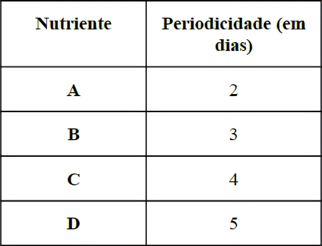MatemáticaUnirG2019Em uma cultura hidropônica, os nutrientes chegam às plantas pela água bombeada a partir de um tanque. Nesse tanque, cada nutriente é diluído, periodicamente, conforme a quantidade de dias definida na tabela a seguir.