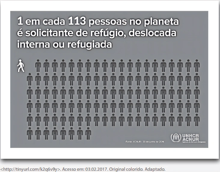 MatemáticaFATEC2017O relatório anual “Tendências Globais”, que registra o deslocamento forçado ao redor do mundo, aponta um total de 65,3 milhões de pessoas deslocadas por guerras e conflitos até o final de 2015 – um aumento de quase 10% se comparado com o total de 59,5 milhões registrado em 2014. Esta é a primeira vez que o deslocamento forçado ultrapassa o marco de 60 milhões de pessoas. No final de 2005, o Alto Comissariado das Nações Unidas para Refugiados (ACNUR) registrou uma média de 6 pessoas deslocadas a cada minuto. Hoje (2015), esse número é de 24 por minuto.