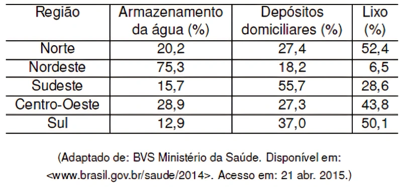 O levantamento sobre a dengue no Brasil tem como objetivo orientar as ações de controle, que possibilitam aos gestores locais de saúde antecipar as prevenções a fim de minimizar o caos gerado por uma epidemia. O Ministério da Saúde registrou 87 mil notificações de casos de dengue entre janeiro e fevereiro de 2014, contra 427 mil no mesmo período em 2013. Apesar do resultado expressivo de diminuição da doença, o Ministério da Saúde ressalta a importância de serem mantidos o alerta e a continuidade das ações preventivas. Os principais criadouros em 2014 são apresentados na tabela a seguir.