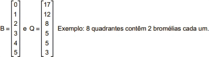 MatemáticaFCMSCSP2021Determinada região da Mata Atlântica foi subdividida em quadrados de 1 m2 de área. Cada um desses quadrados é chamado de quadrante da região. Contando-se o número de bromélias por quadrante da região, pesquisadores organizaram os dados obtidos em duas matrizes colunas, denotadas por B e Q. A matriz B indica o número de bromélias por quadrante e a matriz Q indica o número de quadrantes com a quantidade de bromélias do campo correspondente na matriz B, por quadrante. Observe as duas matrizes com os dados obtidos e um exemplo explicativo da notação: