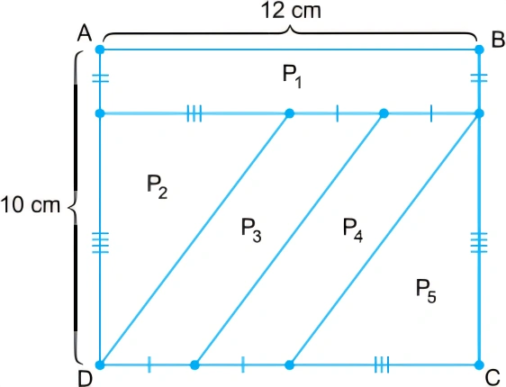 MatemáticaAlbert Einstein2020Uma peça retangular ABCD, de 10 cm por 12 cm, será dividida em cinco peças, como indica a figura, em que segmentos com as mesmas marcações têm comprimentos iguais. P1, P2, P3, P4 e P5 indicam os perímetros das cinco peças, em centímetros.