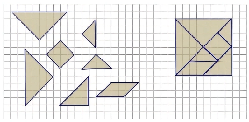 MatemáticaUFPE2016O Tangram, representado na malha abaixo, é um famoso e antigo quebra-cabeça chinês composto por sete peças de formatos geométricos: dois triângulos grandes, dois triângulos pequenos, um triângulo médio, um paralelogramo e um quadrado. Com estas sete peças, é possível formar várias figuras diferentes.