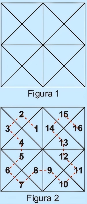 MatemáticaOBMEP2017Sérgio quer numerar de 1 a 16 os triângulos da Figura 1 de tal modo que números consecutivos fiquem em triângulos que têm um lado comum. Por exemplo, ele pode numerar os triângulos como na Figura 2.