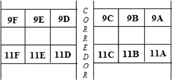 MatemáticaUFVJM2016João e maria resolveram viajar de avião com seus filhos adolescentes Paulo, Bianca e Pedro. Eles compraram as passagens de forma que três deles vão juntos na fileira 9 (9 A, 9 B e 9 C) e os outros dois vão juntos na fileira 11 (11 F e 11 E) conforme a figura a seguir.