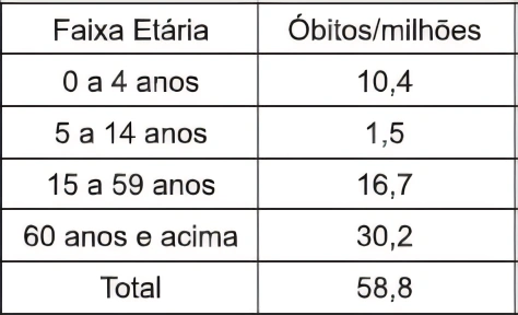 Admitindo–se que o número de mortes ocorridas no Brasil, em 2015, esteja proporcionalmente de acordo com essa tabela, e que, segundo o IBGE, a taxa de mortalidade foi de 6,29 pessoas por mil habitantes quando a população era de 184 milhões, é correto afirmar que o número de pessoas de 0 a 4 anos, em 2015, foi de, aproximadamente,