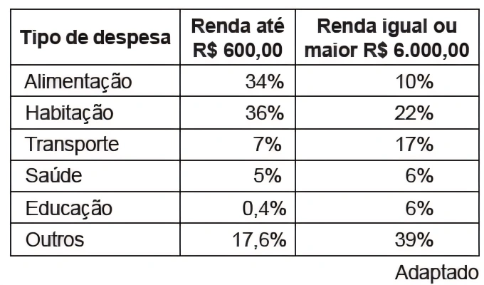 Se considerarmos duas famílias com renda de R$ 600,00 e R$ 6.000,00, respectivamente, cujas despesas variam de acordo com a tabela acima, podemos concluir que os valores em reais gastos com a habitação pela família de maior renda em relação aos da família de menor renda são, aproximadamente,