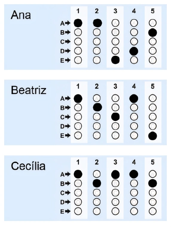 MatemáticaOBMEP2016A figura mostra os cartões com as respostas de Ana, Beatriz e Cecília para uma prova de múltipla escolha, com cinco questões e alternativas A, B, C, D e E. Ana acertou quatro questões, Beatriz acertou uma e Cecília acertou três. Qual foi a questão que Ana errou?