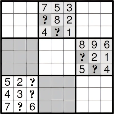 Agora utilizando o conhecimento das regras de Sudoku que não pode haver números repetidos nas linhas, colunas e malhas, determine a soma de todos os números que deverão ocupar as casas com interrogações.
