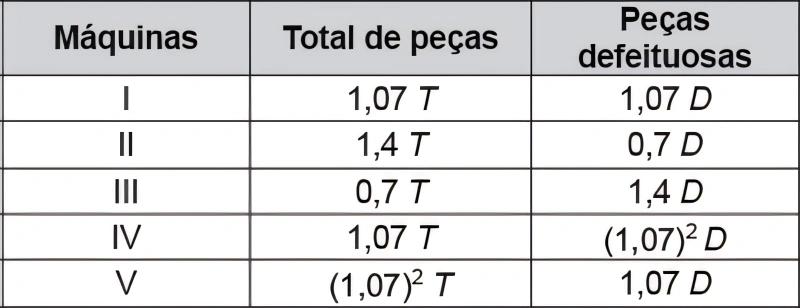 MatemáticaENEM2017Uma indústria utiliza um índice de desempenho para as suas máquinas que é diretamente proporcional à quantidade total de peças produzidas e inversamente proporcional ao quadrado da quantidade de peças defeituosas produzidas. Em um semestre, cinco máquinas produziam a mesma quantidade T de peças, sendo D delas defeituosas. No semestre seguinte, houve uma alteração na quantidade total de peças produzidas por cada máquina e também na quantidade de peças defeituosas, de acordo com o quadro.