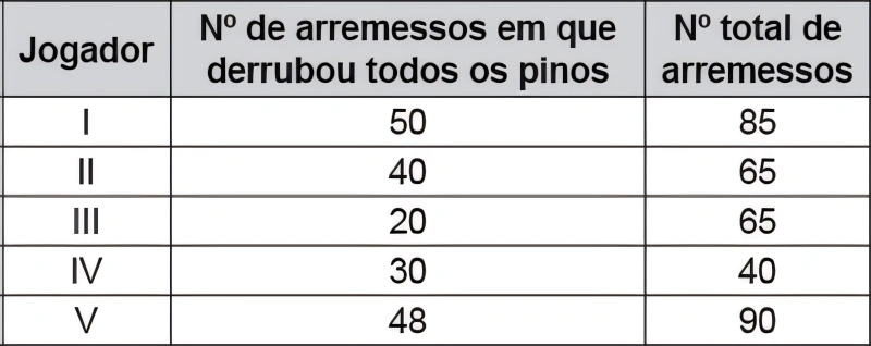 MatemáticaENEM2017Um jogo de boliche consiste em arremessar uma bola sobre uma pista com o objetivo de atingir e derrubar o maior número de pinos. Para escolher um dentre cinco jogadores para completar sua equipe, um técnico calcula, para cada jogador, a razão entre o número de arremessos em que ele derrubou todos os pinos e o total de arremessos efetuados por esse jogador. O técnico escolherá o jogador que obtiver a maior razão. O desempenho dos jogadores está no quadro.