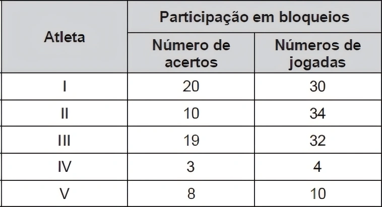 MatemáticaENEM2016O técnico de um time de voleibol registra o número de jogadas e de acertos, por atleta, em cada fundamento, para verificar os desempenhos dos jogadores. Para que o time tenha um melhor aproveitamento no fundamento bloqueio, ele decide substituir um dos jogadores em quadra por um dos que estão no banco de reservas. O critério a ser adotado e o de escolher o atleta que, no fundamento bloqueio, tenha apresentado o maior número de acertos em relação ao número de jogadas de que tenha participado. Os registros dos cinco atletas que se encontram no banco de reservas, nesse fundamento, estão apresentados no quadro.
