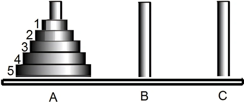 Na torre de Hanói, o desafio consiste em transportar uma a uma essas quatro peças para um dos outros pinos num menor número possível de movimentos, transferindo assim, toda a Torre de Discos que está na Haste A para a Haste C. Para o primeiro movimento transferimos o disco 1 para a haste B e em seguida para o segundo movimento, transferimos o disco 2 para a haste C, etc.