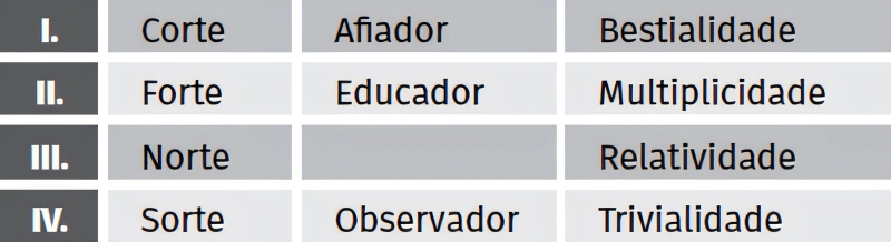 Seguindo a mesma lógica, assinale a palavra que completa, de maneira coerente, o espaço vazio na linha III da tabela.