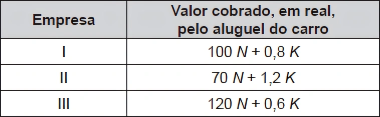 MatemáticaENEM2017Chegando ao destino de uma mesma viagem, os turistas X e Y alugarão, cada um deles, um carro. Fizeram, previamente, cotações com as mesmas três locadoras de automóveis da região. Os valores dos aluguéis estão representados pelas expressões dadas no quadro, sendoK o número de quilômetros percorridos, e N o número de diárias pagas pelo aluguel.