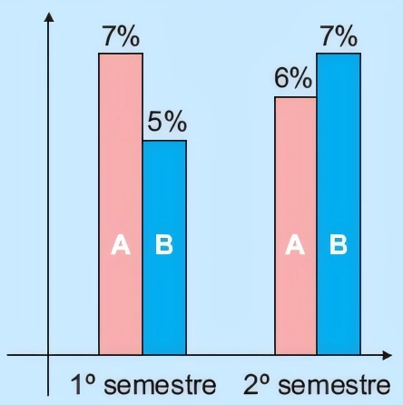 MatemáticaOBMEP2016O gráfico representa o percentual de aumento do preço de dois produtos, A e B, em uma mercearia no primeiro e no segundo semestres do ano passado. As afirmativas abaixo referem-se ao período completo do ano passado. Qual delas é a correta?