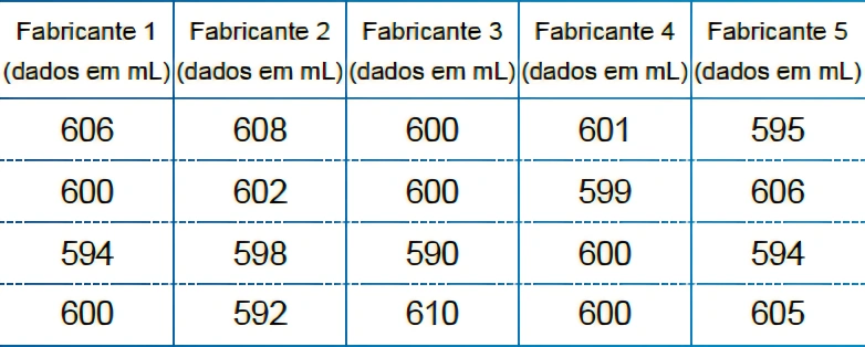 MatemáticaFAMECA2019Uma indústria de bebidas deseja trocar sua máquina de enchimento automático de garrafas e, para isso, solicitou, a diferentes fabricantes de máquinas amostras de garrafas cujos rótulos indicam volumes de 600mL. Após a análise das amostras, os dados foram registrados na tabela: