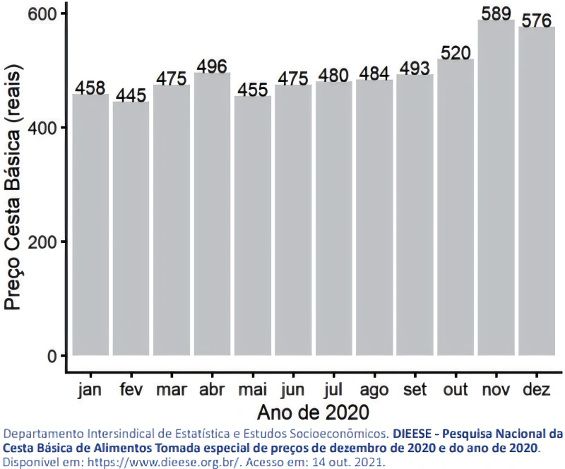 O gráfico apresenta o preço da cesta básica, em cada um dos doze meses no ano de 2020, na capital Campo Grande (MS).