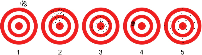 MatemáticaFAMECA2018Um professor de Estatística explicou a seus alunos que, quanto menos afastados os elementos de uma amostra estão da sua média, menor a variância e maior é a precisão dessa amostra. As figuras de 1 a 5 representam alvos e cada ponto preto representa um local alvejado por um tiro.