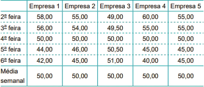 MatemáticaUNICID2020Paula pretende investir em ações da Bolsa de Valores e, após algumas análises, apenas cinco empresas se enquadraram em seus critérios. A opção escolhida foi aquela, entre as cinco, que teve menor variância de preços na semana anterior, ou seja, a que manteve seus preços mais próximos da média semanal. A tabela mostra os valores, em reais, da amostra de ações de cada empresa.