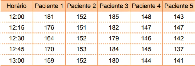 MatemáticaFEMA2017A tabela mostra os registros de cinco valores consecutivos de pressões sistólicas, em mmHg, obtidos dos exames de MAPA (Monitorização Ambulatorial da Pressão Arterial) de cinco pacientes, entre os horários de 12:00 e 13:00.
