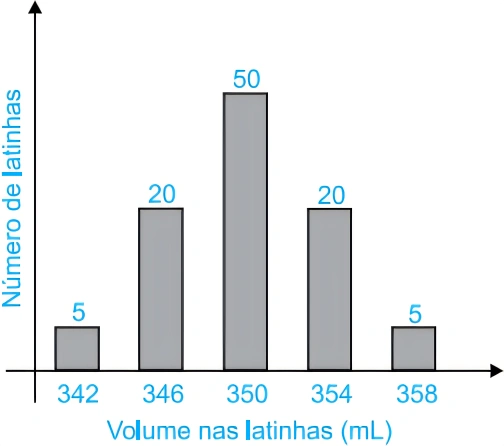 MatemáticaUNICID2019Uma empresa estava sendo processada sob suspeita de fraudar a quantidade de refrigerante contida em suas latinhas. Para investigar essa suspeita, um analista retirou uma amostra de latinhas, verificou os volumes e registrou as informações obtidas no gráfico a seguir.