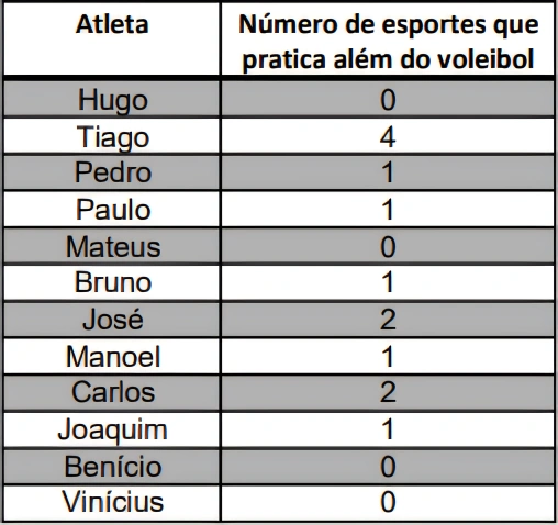 MatemáticaUPE2020Os 12 atletas do time de voleibol da Escola Viver Bem estão sendo entrevistados pelo seu treinador, para definir quais serão os jogadores titulares. Em determinado momento, o treinador perguntou o número de esportes que os atletas praticavam, além do voleibol. O resultado está apresentado no quadro abaixo: