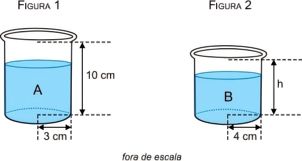 MatemáticaUNIVAG2016Um cilindro circular reto A de raio de base igual a 3 cm e altura igual a 10 cm contém um determinado volume de água que corresponde a 60% de sua capacidade total, conforme mostra a figura 1. Se essa água for transferida para um cilindro circular reto B, inicialmente vazio, com 4 cm de raio de base, ocupará 75% do volume do cilindro B, conforme mostra a figura 2.