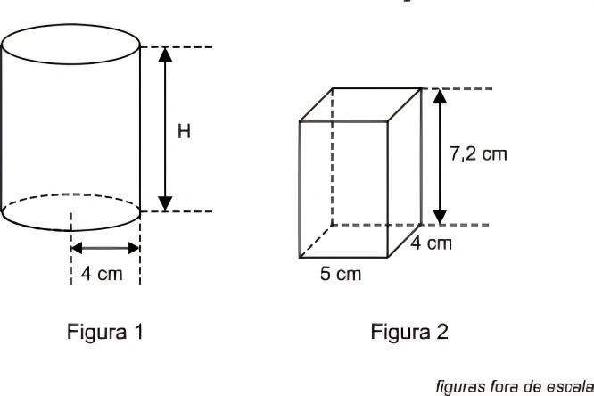 MatemáticaUFSCAR2017Um cilindro com medidas internas iguais a 4 cm de raio da base e altura H, conforme mostra a figura 1, está totalmente cheio de água. Toda essa água será colocada em um prisma de base retangular, com medidas internas iguais a 5 cm de comprimento por 4 cm de largura e 7,2 cm de altura, que ficará totalmente cheio, conforme mostra a figura 2.