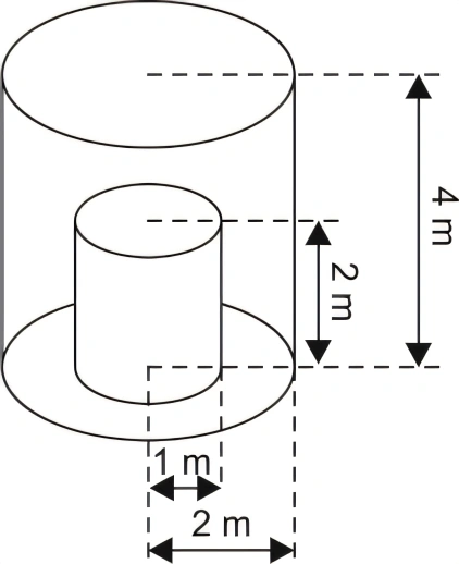 MatemáticaUNIPAR2019Um recipiente de água tem a forma de um cilindro circular reto de altura 4 m e raio da base 2 m. Dentro desse recipiente, com o intuito de diminuir seu volume, há, totalmente apoiada na base, uma estrutura sólida que também tem a forma de um cilindro circular reto, de altura 2 m e raio da base 1 m, conforme a figura abaixo.