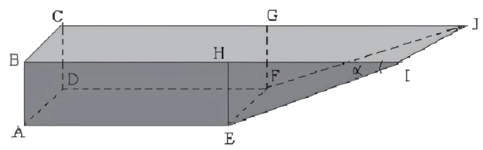 MatemáticaUNIFOR2015O proprietário de uma residência construiu em seu quintal uma piscina com o formato da figura abaixo. Analisando a figura abaixo, podese observar que ABCDEFGH representa um paralelepípedo retangular e EFGHIJ, um prisma cuja base EHI é um triângulo retângulo, com ângulo reto no vértice H e ângulo α no vértice I tal que sen α = 3/5. Sabendo que AB = 3m, AE = 5m e AD = 3m, quantos litros de água serão necessários para encher dois terços do volume da piscina?
