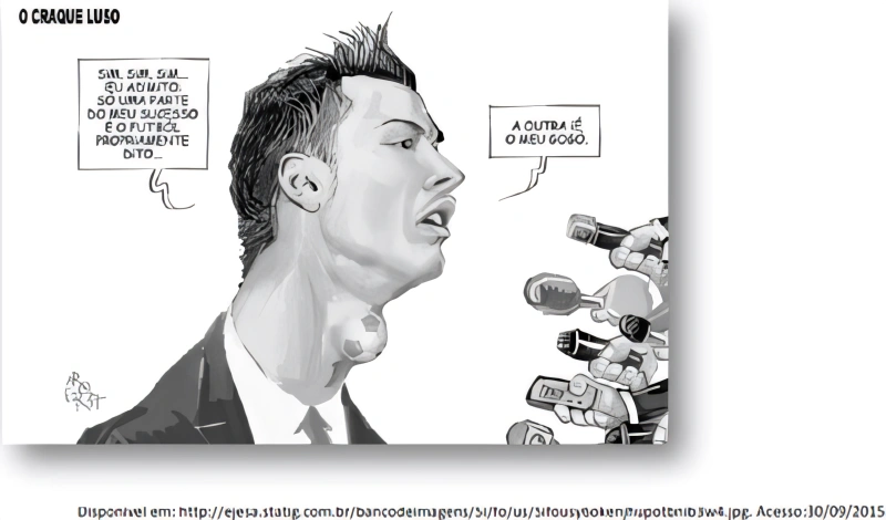 Considerado os elementos visuais da charge, pode‐se concluir que a imagem da bola de futebol no pescoço de Cristiano Ronaldo