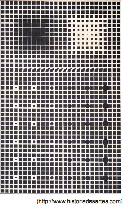 A obra reproduzida faz parte do movimento denominado Op Art – Arte Óptica. Analisando-a, conclui-se que ela