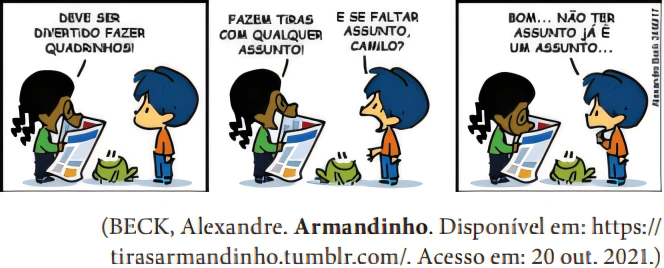 Alexandre Beck, na construção de sua tirinha, tendo em vista a intencionalidade de sua mensagem, utiliza recursos linguísticos que evidenciam uma função de linguagem.