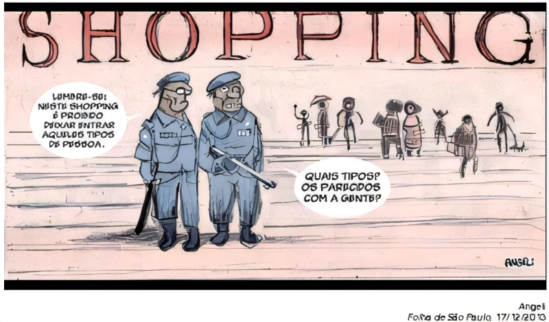Por meio de aspectos gráficos, o cartum sugere o caráter generalizante que pode ter um preconceito.Um aspecto que aponta para essa generalização é: