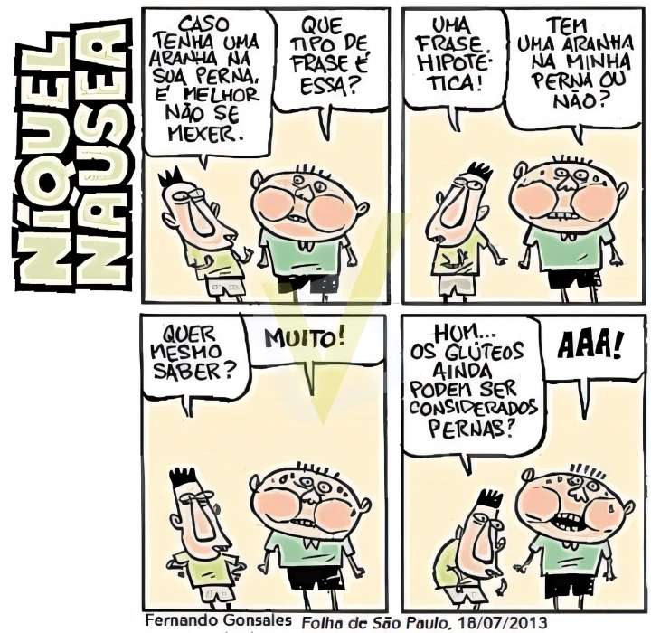 Nos quadrinhos, há uma representação de crescente desespero do personagem que estaria com a aranha em sua perna. A representação desse desespero é construída por meio do emprego de: