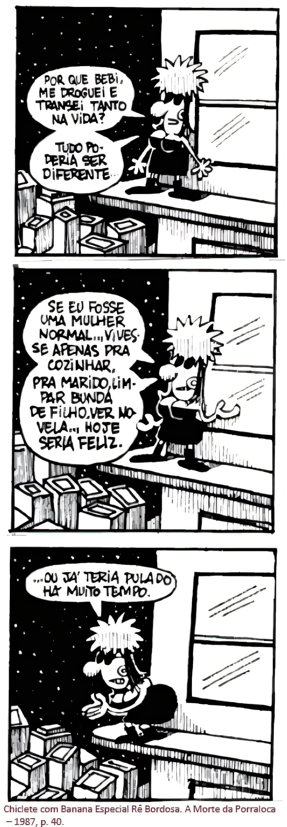 A personagem Rê Bordosa, retratada na tirinha a seguir de autoria do cartunista Arnaldo Angeli Filho, faz parte de uma série que circulou inicialmente no jornal Folha de São Paulo e depois nas edições da revista Chiclete com Banana entre 1984 e 1987.