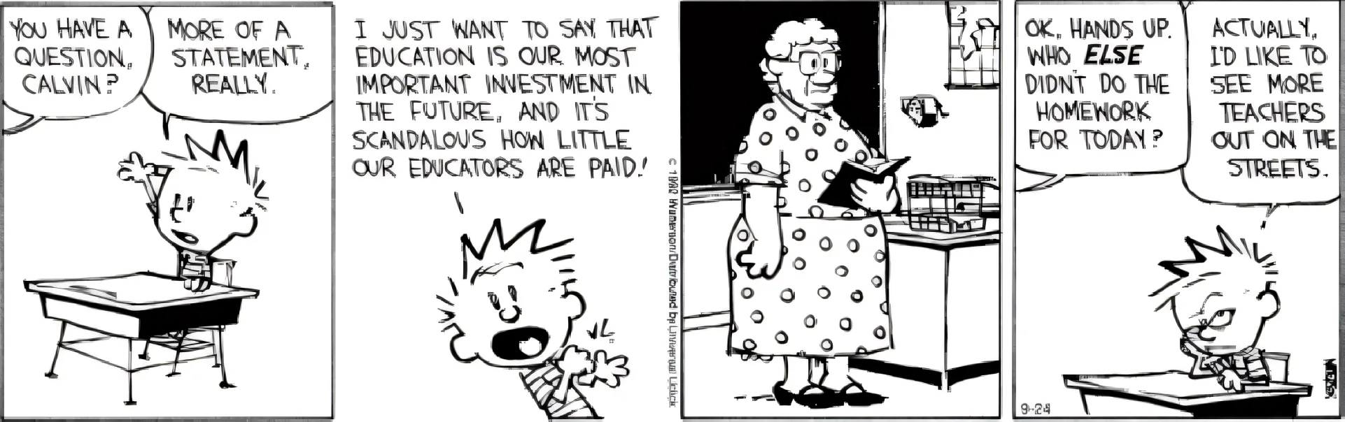 In the comic strip above, Calvin becomes upset because:
