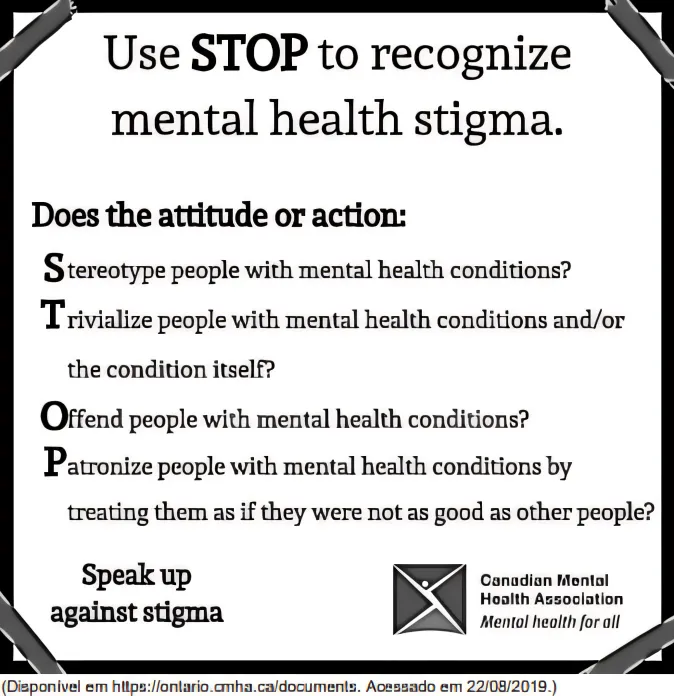 A Associação Canadense de Saúde Mental é uma organização sem fins lucrativos que combate o estigma sobre a saúde mental, promovendo ações em favor de pessoas que sofrem com doenças dessa natureza. O cartaz abaixo, direcionado à população em geral, foi publicado no site dessa associação.