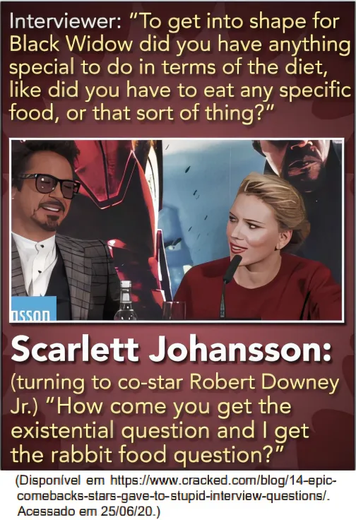 A situação abaixo ocorreu em uma entrevista com a atriz Scarlett Johansson e o ator Robert Downey Junior, que atuaram juntos em um filme.
