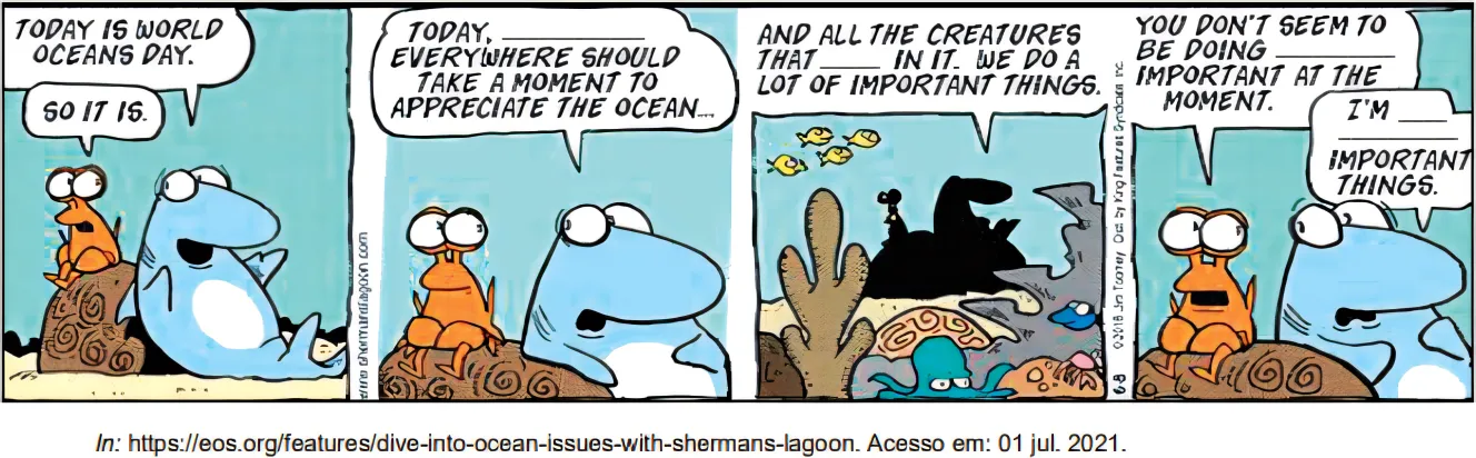 Considerando o contexto e a gramática da língua inglesa, assinale a alternativa cujas palavras completam a sequência CORRETA dos espaços nos balões da tira cômica