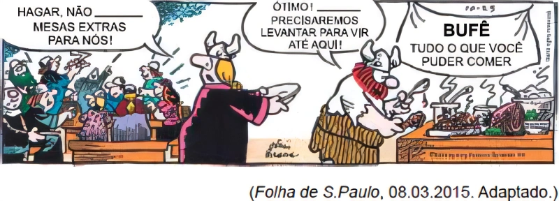 Considerando as relações de coesão e coerência estabelecidas entre as falas de Hagar e sua esposa, assinale a alternativa que preenche, correta e respectivamente, as lacunas do cartum.