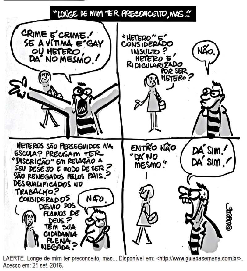 Levando em consideração os elementos verbais e não verbais da charge e tomando como ponto de partida o discurso “longe de mim ter preconceito, mas...”, o conectivo “mas” apresenta, como efeito de sentido,