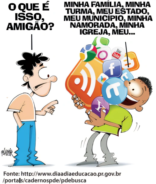 A charge apresenta visão crítica sobre formas de interação social na atualidade porque as redes sociais disponíveis na internet têm